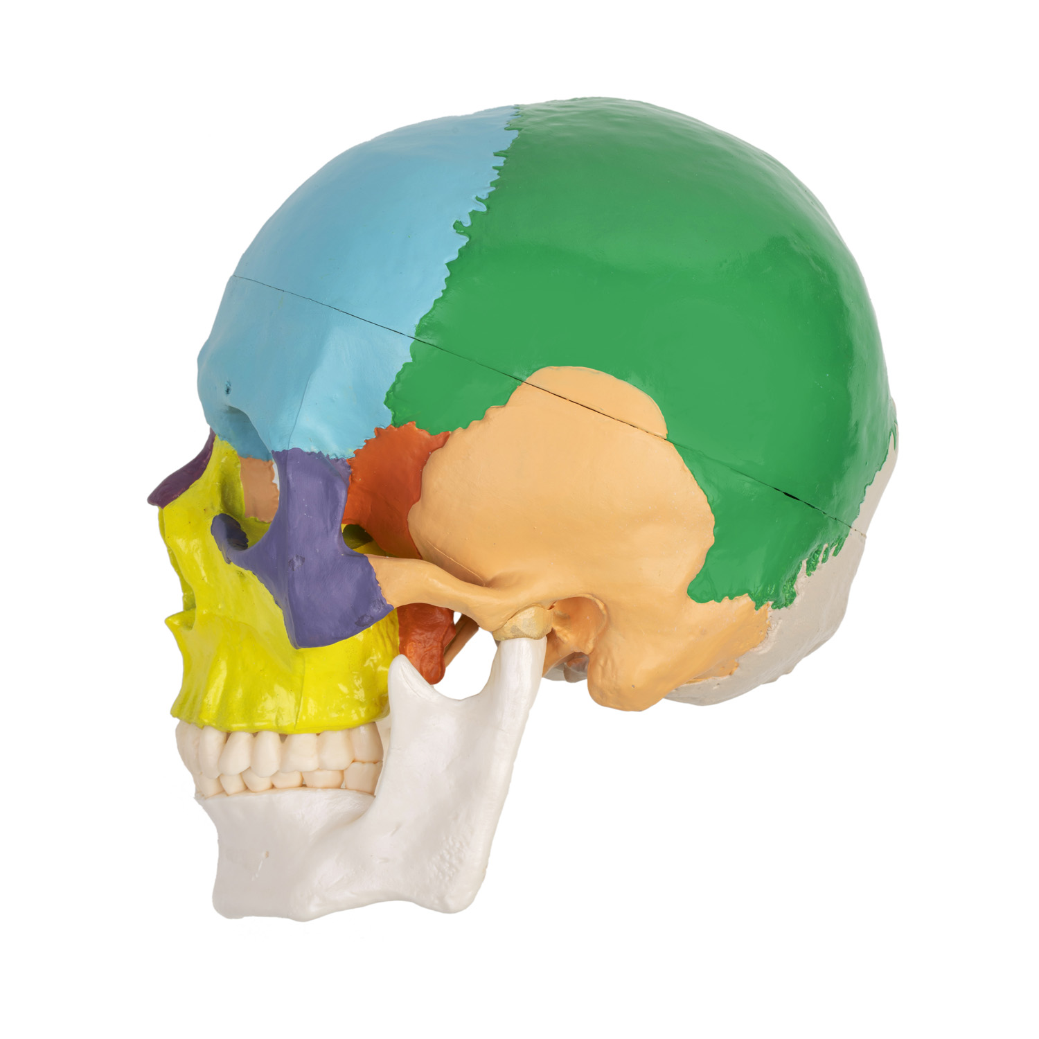 Modèle 3D détaillé du crâne humain, comprenant le crâne, la base du crâne et la mâchoire.