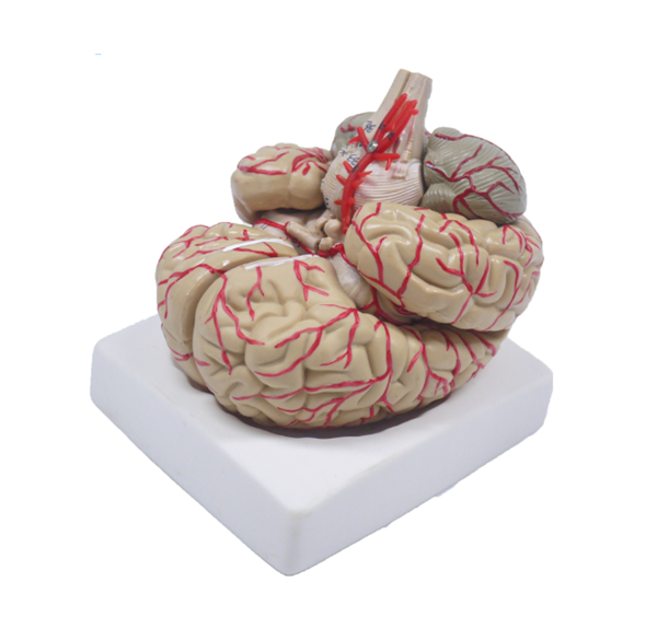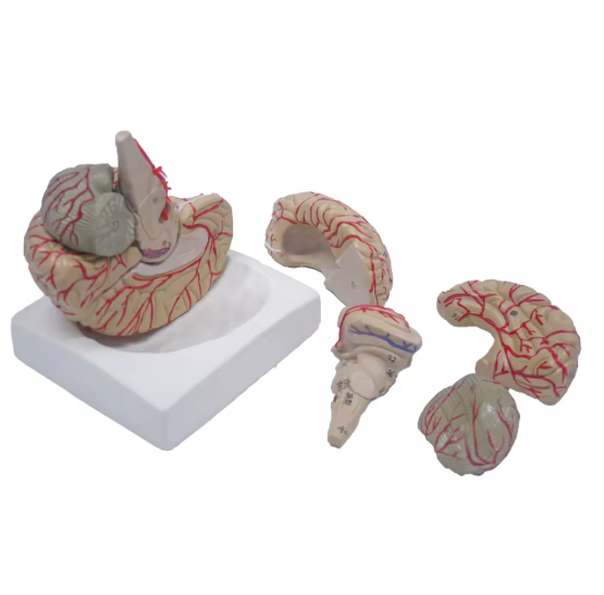 Modèle anatomique du cerveau détaillant la structure des hémisphères, du cervelet et du tronc cérébral ainsi que les principales artères alimentant le système nerveux central. Les veines et les artères sont surlignées en rouge pour aider à identifier le trajet des vaisseaux et à comprendre leur rôle dans la circulation cérébrale.