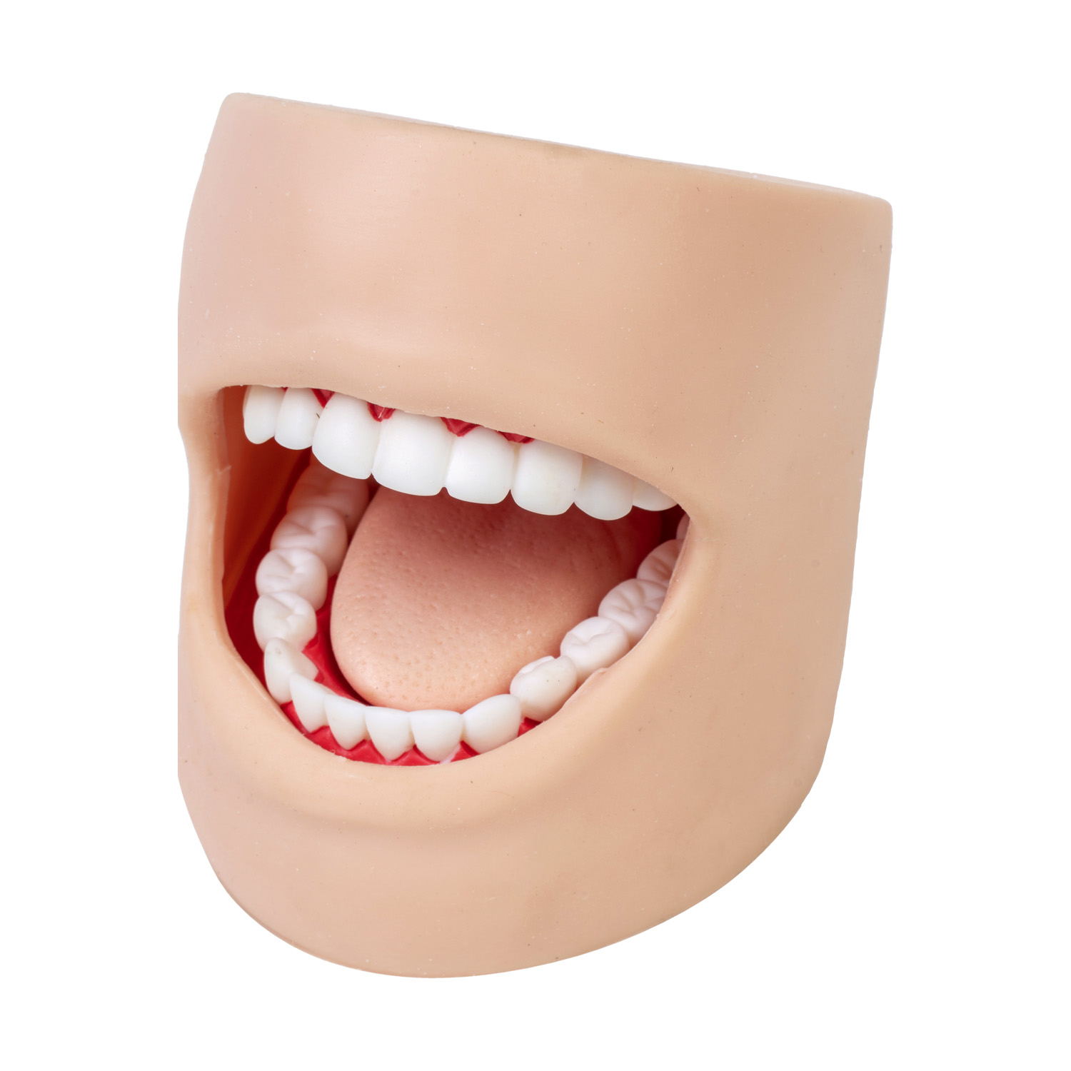 La structure anatomique du modèle reproduit les proportions naturelles de la mâchoire humaine. Tous les éléments clés sont visibles : gencives, joues, palais et les différents types de dents - incisives, canines, prémolaires et molaires. Le modèle convient donc aussi bien aux exercices pratiques qu'aux activités éducatives.