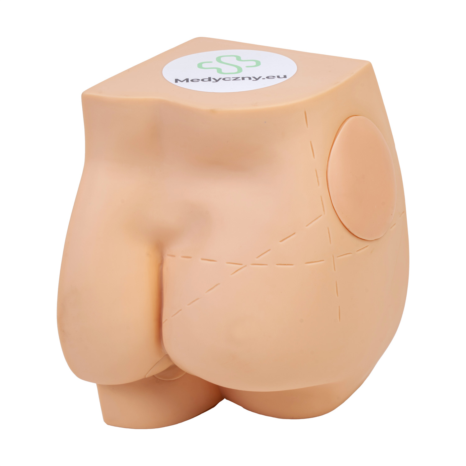 La réplique réaliste de la fesse permet à l'utilisateur d'apprendre et de perfectionner les techniques d'injection selon les méthodes de Clark et de Hochstatter, ainsi que la détermination correcte du quadrant à injecter. Le modèle est équipé de repères, tels que le grand iléon et les épines iliaques, pour faciliter la détermination précise du site d'injection.