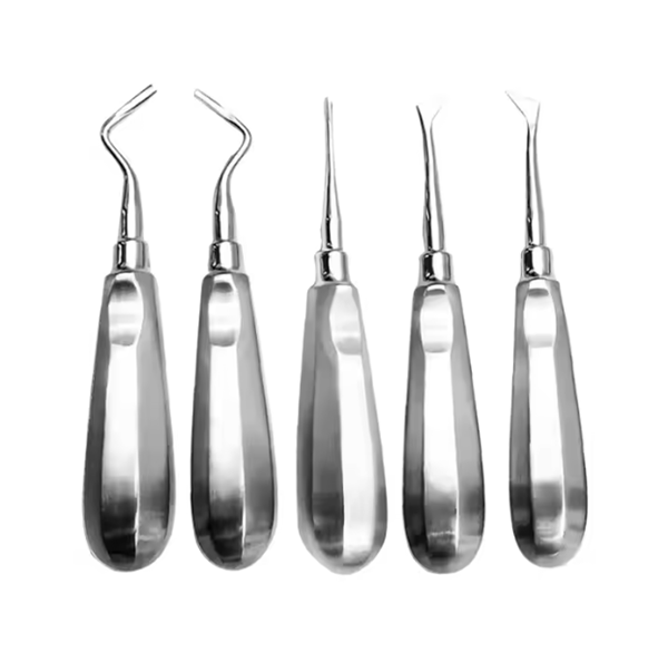 Ce jeu de cinq leviers dentaires est conçu pour enseigner les techniques d'extraction des dents et des racines dans les laboratoires médicaux.